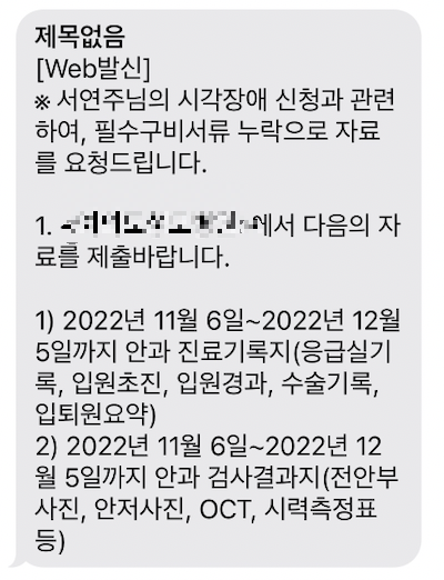 맨 처음에 제출할 때에도 입원, 외래 기록지를 첨부해서 제출하였는데, '응급실 기록'과 '안과 검사결과지'가 빠져 있었다고 한다. 서류를 재발급 받으려면 또 다시 외래를 예약하고 서류를 교수님께 부탁하고, 발급 받는 비용도 추가로 들게 된다.