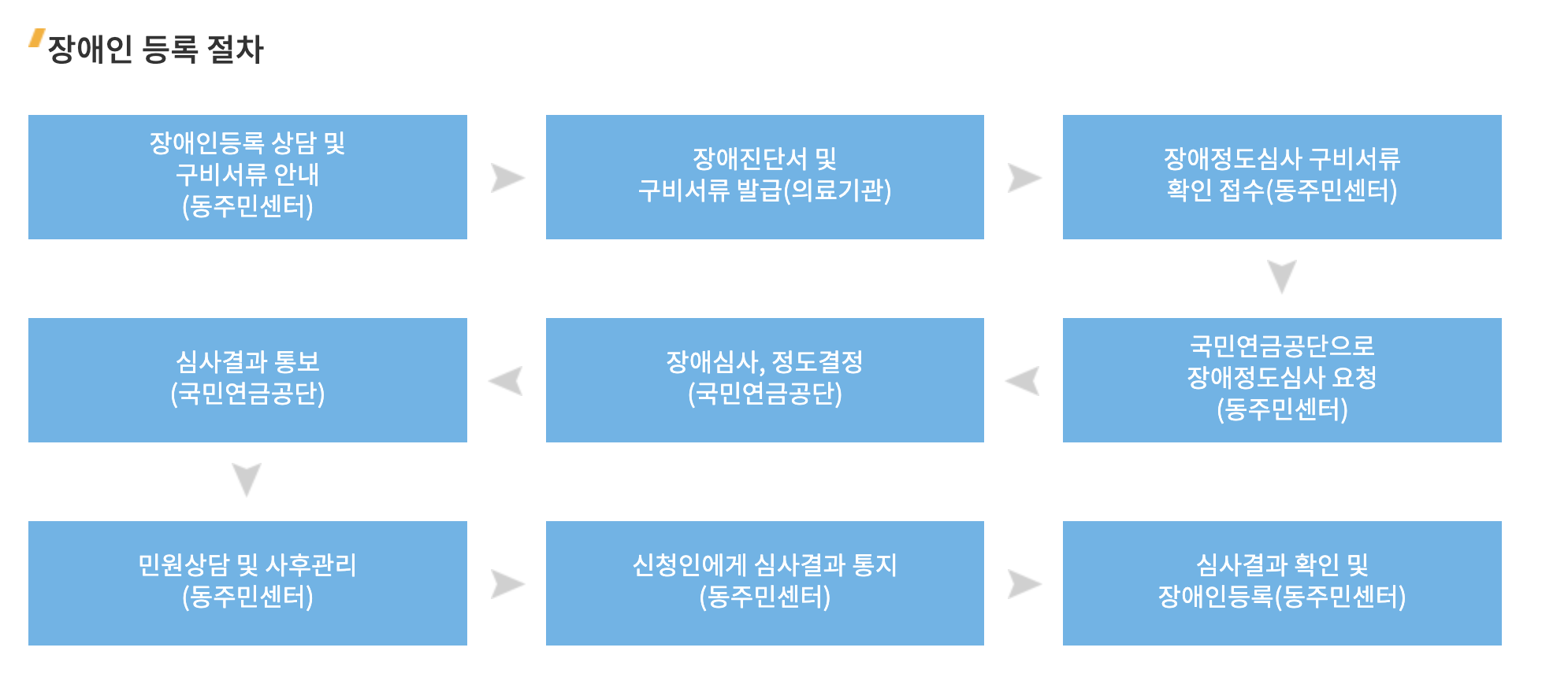 - 1단계 장애인등록 상담 및 구비서류 안내(동주민센터)