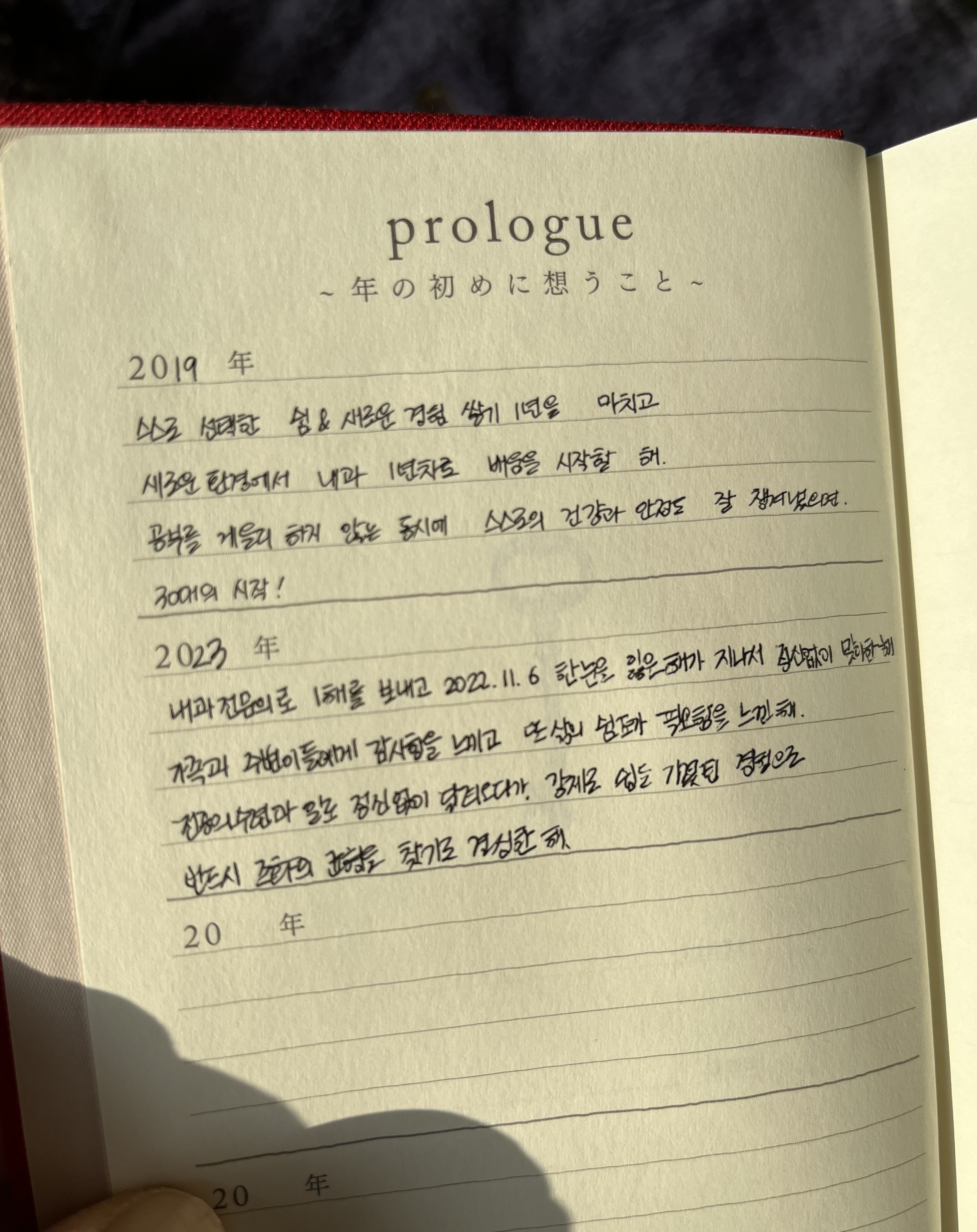 다시 입원하게 되면서, 준비물로 방구석에 묵혀 있던 ‘5년 일기장’을 꺼내 왔다. 5년 전, 친구 @yuzu 의 추천으로 구입하게 된 5년 일기장이다. 친구는 5년 일기를 쓰면서, 매년 같은 날의 내가 무슨 생각을 하고, 또 무슨 깨달음을 얻으며 살아왔는지 과정을 볼 수 있어 너무 좋다고 했다.