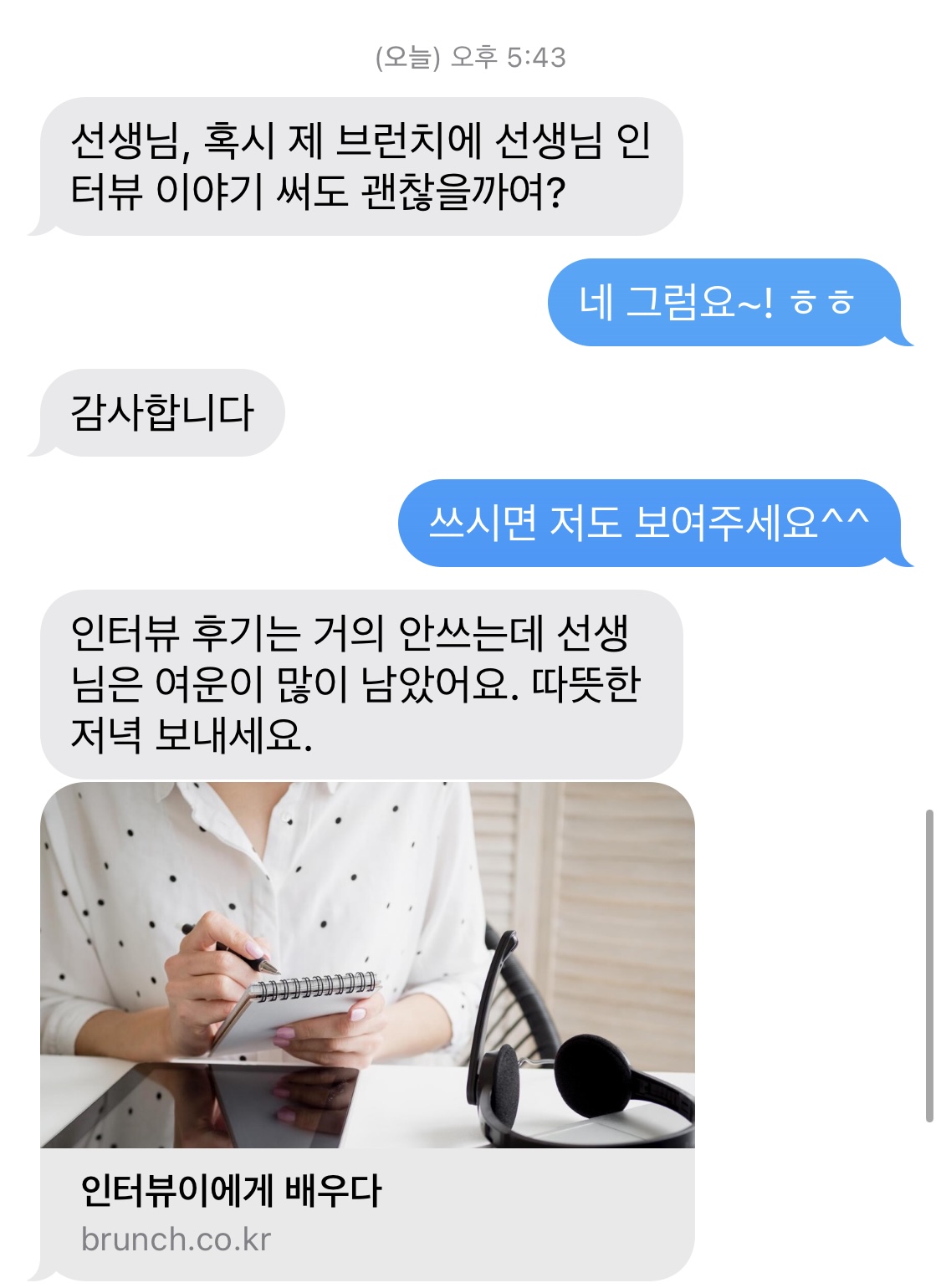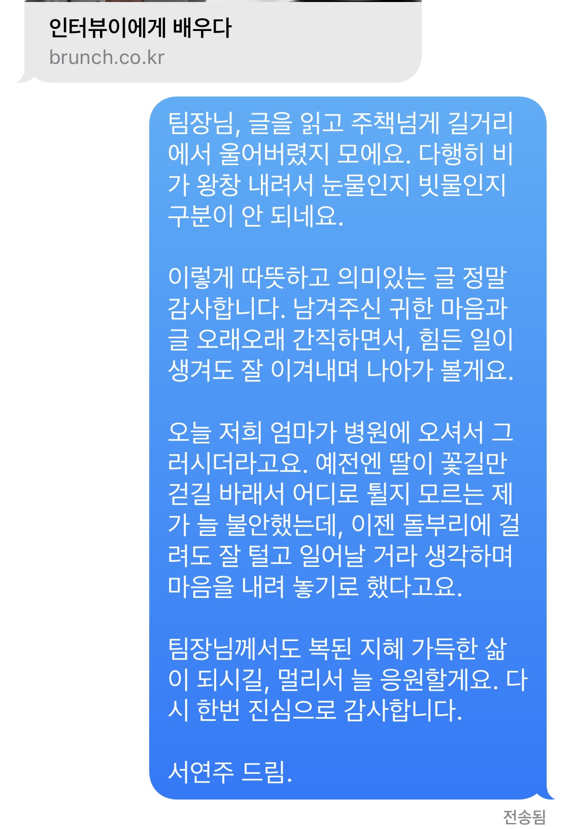 인터뷰 내내 따뜻했던, 그리고 내가 썼던 글을 꼼꼼히 읽어 나조차도 기억 안나는 질문을, 꺼내오셨던 인터뷰어가 이런 문자를 보내셨다.